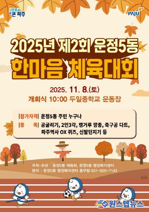 원스텝뉴스 천규영 기자 | 파주시 운정5동은 오는 11월 8일 토요일 두일중학교에서 녩년 제2회 한마음 체육대회’를 개최한다.