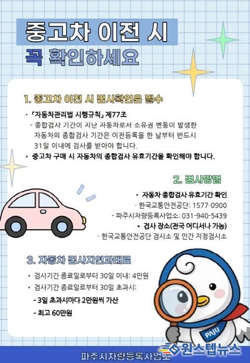 원스텝뉴스 이병희 기자 | 파주시는 중고차 이전등록 시 종합검사 의무를 알지 못해 과태료가 부과되는 사례를 예방하기 위해, 취득세 납부 단계에서 ‵종합검사 의무 이행 안내문′을 함께 제공해 시민들이 기한 내 검사를 받을 수 있도록 적극 홍보할 계획이라고 밝혔다.