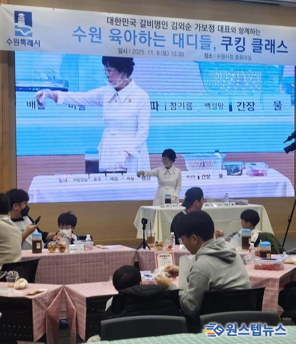 원스텝뉴스 이병희 기자 | 수원특례시는 8일 시청 중회의실에서 ‘수원 육아하는 대디들(수육대)’ 다섯 번째 오프라인 활동인 ‘쿠킹클래스 with 가보정’을 열었다. 이번 체험에는 수육대 참여 아빠와 자녀 50가족, 120여 명이 함께했다.