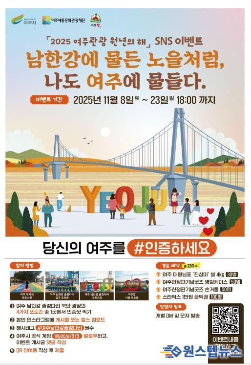 원스텝뉴스 이병희 기자 | 여주시는 '2025 여주 관광 원년의 해'를 기념하여 대표 관광명소인 여주 남한강 출렁다리에서 ‘포토 SNS 인증샷 이벤트’를 11월 8일부터 23일까지 16일간 진행한다.