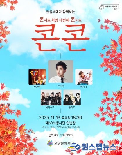 원스텝뉴스 천규영 기자 | 고양문화재단은 오는 11월 13일 오후 6시 30분, 고양시 덕양구에 위치한 제60보병사단 연병장에서 [권율부대와 함께하는 콘서트 차량 네 번째 콘서트 ‘콘콘’]을 개최한다.