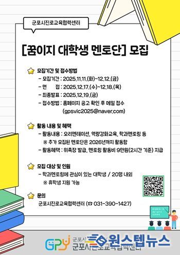 원스텝뉴스 이병희 기자 | (재)군포시청소년재단 군포시진로교육협력센터는 청소년 진로탐색 프로그램인 '꿈이지 대학생 멘토단'의 멘토를 모집한다.
