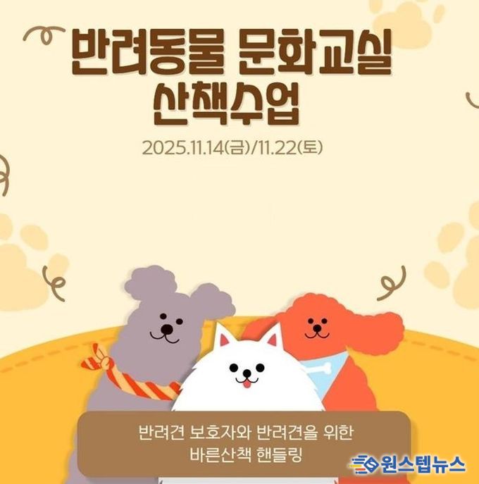 원스텝뉴스 이병희 기자 | 시흥시는 오는 11월 14일과 22일 반려동물과 함께하는 문화교실(산책 수업)을 운영한다. 이번 프로그램은 시흥시에 동물 등록이 완료된 반려견을 양육하는 시민을 대상으로 진행되며, 수업별 30마리씩 선착순 모집한다.