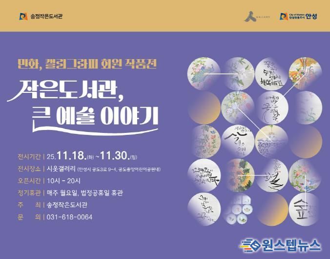 원스텝뉴스 천규영 기자 | 안성천 공도 작은미술관 시옷갤러리에서는 오는 11월 18일(화)부터 30일(일)까 지 송정작은도서관의 지역 주민으로 구성된 민화 캘리그라피 회원들의 작품을 모은 전시회 ‘작은도서관, 큰 예술 이야기’가 열린다.