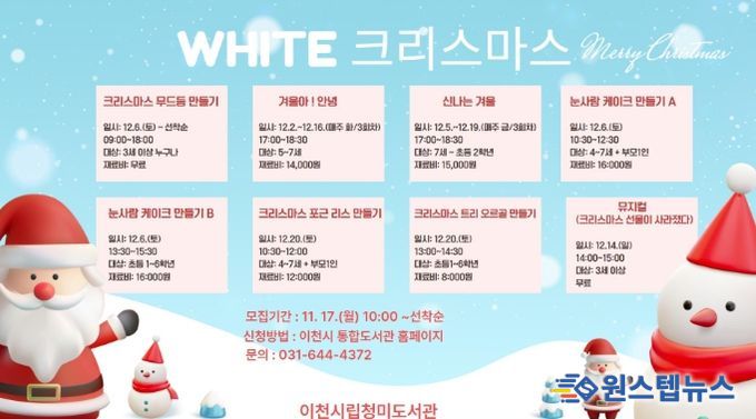 원스텝뉴스 천규영 기자 | 이천시 청미도서관이 다가오는 크리스마스를 맞아 가족이 함께 즐길 수 있는 다채로운 겨울 프로그램을 운영한다. 이번 프로그램은 유아부터 가족 단위 이용자까지 모두가 참여할 수 있도록 구성되어, 따뜻하고 포근한 겨울 감성 속에서 즐겁고 뜻깊은 경험을 선사할 예정이다.