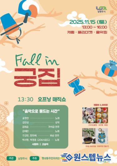 원스텝뉴스 천규영 기자 | 남양주시는 오는 15일 남양주시 역사문화유산인 궁집에서 청년 인재와 시민이 함께하는 ‘Fall in 궁집’ 음악회를 개최한다고 12일 밝혔다.