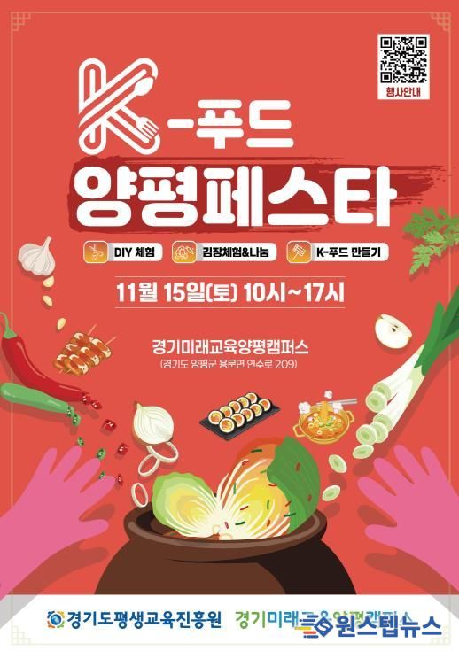 원스텝뉴스 천규영 기자 | 경기도평생교육진흥원 경기미래교육양평캠퍼스가 오는 15일 ‘음식으로 배우고 나누는 평생학습’을 주제로 한국의 음식문화와 전통을 체험할 수 있는 ‘K-푸드 양평페스타’를 개최한다.