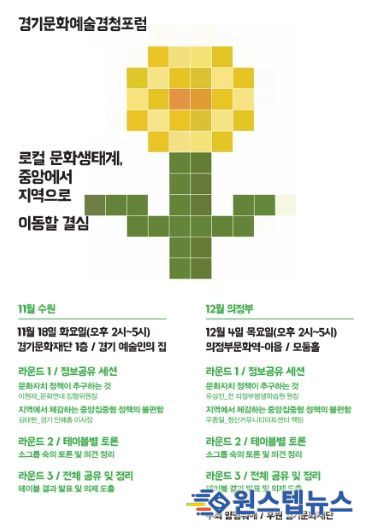 경청포럼은 국민주권정부의 문화정책 변화와 함께 경기도가 준비 중인 기초지자체 기반의 상향식 지역문화 정책의 기본 방향을 가늠해 보기 위해 경기 남부(수원)와 북부(의정부)에서 각각 11월 18일 오후 2시(수원 경기문화재단 경기예술인의 집)와 12월 4일 오후 2시(의정부문화역-이음)에 열린다.