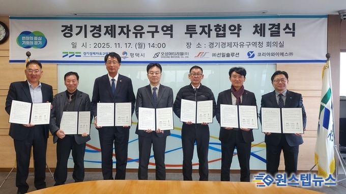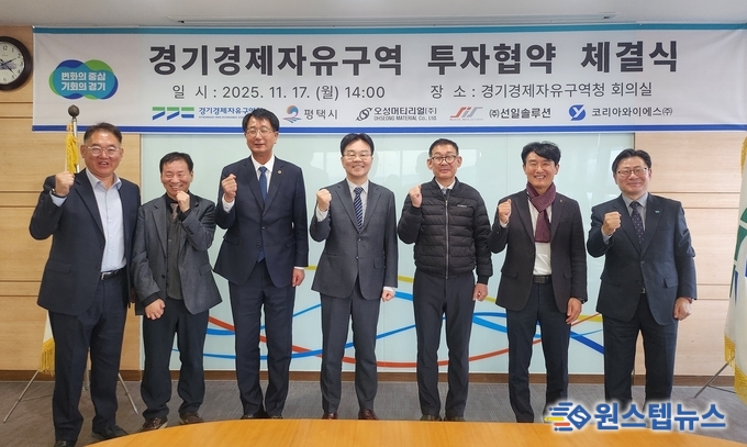 경기경제자유구역청(이하 경기경제청)은 17일 경기경제청에서 평택시, 자동차부품 제조기업 3개 사와 평택 포승(BIX)지구 내 408억 원 규모의 투자협약을 체결했다고 밝혔다.