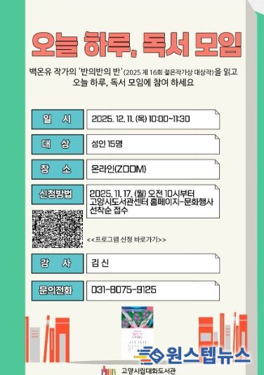 원스텝뉴스 천규영 기자 | 고양특례시 대화도서관은 책을 매개로 다양한 생각과 의견을 나누는 독서 모임 프로그램 ‘오늘 하루, 독서 모임’을 오는 12월 11일에 운영한다.