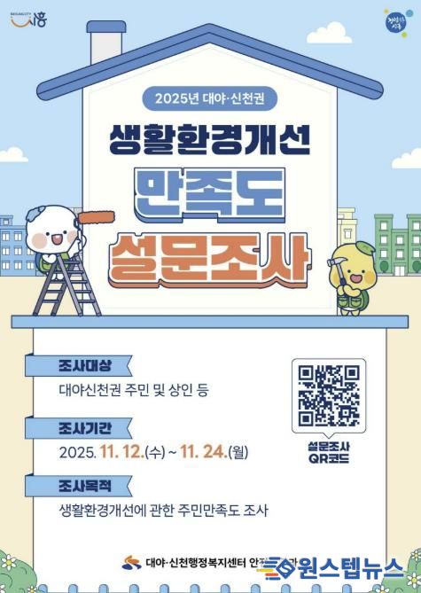 원스텝뉴스 이병희 기자 | 시흥시 대야ㆍ신천행정복지센터는 대야ㆍ신천권역의 생활환경개선을 위한 주민 만족도 조사를 실시하고 있다. 이번 조사는 안전생활과에서 추진 중인 생활환경개선사업 전반에 대한 주민 의견을 적극 수렴하고, 향후 정책과 사업 개선에 반영하기 위해 마련됐다.