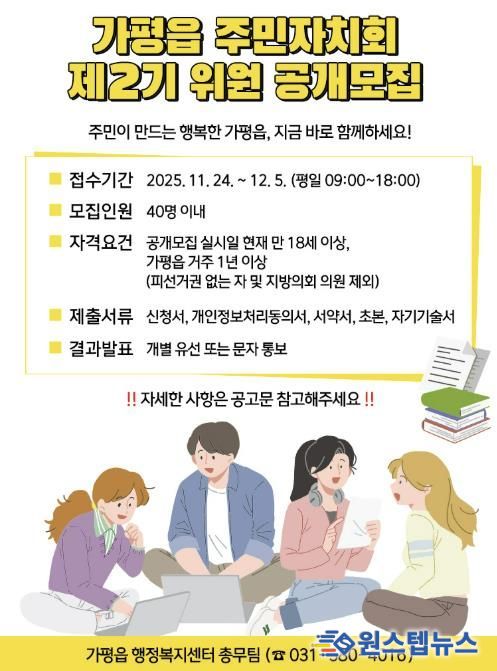 접수는 11월 24일부터 12월 5일까지 12일간이며, 가평읍 행정복지센터 총무팀에 신청하면 된다. 모집 인원은 40명 이내이며, 신청 자격은 공개모집 공고일(11월 11일) 기준 만 18세 이상이면서 가평읍에 1년 이상 거주한 주민이다. 다만 '공직선거법' 제19조에 따라 피선거권이 없는 주민과 지방의회 의원은 신청 대상에서 제외된다.