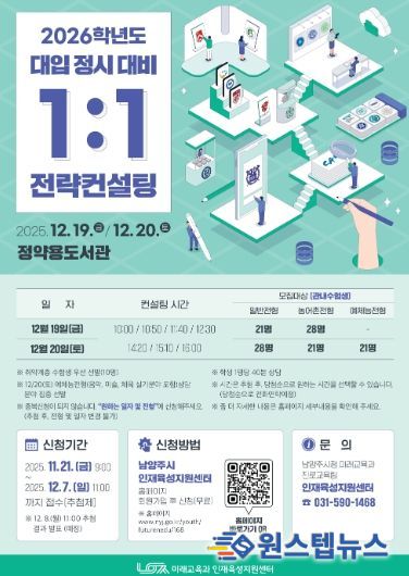 원스텝뉴스 천규영 기자 | 남양주시는 11월 21일부터 12월 7일까지 ‘2026학년도 대입 정시 대비 1:1 전략컨설팅’에 참여할 관내 수험생을 모집한다.