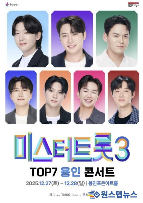 원스텝뉴스 천규영 기자 | 용인문화재단은 오는 12월 27일부터 28일까지 용인포은아트홀에서 ‘미스터트롯3 TOP7 콘서트’를 선보인다. 공연은 27일 오후 1시·6시, 28일 오후 1시 총 3회 진행된다.
