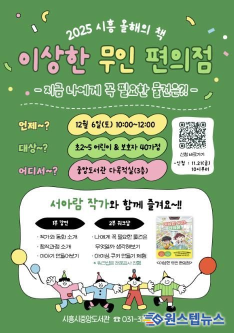 원스텝뉴스 이병희 기자 | 시흥시중앙도서관은 ‘2025 시흥 올해의 책’ 어린이 분야 선정 도서인 '이상한 무인 편의점'의 서아람 작가 초청 강연을 오는 12월 6일 오전 10시부터 중앙도서관 다목적실에서 운영한다.