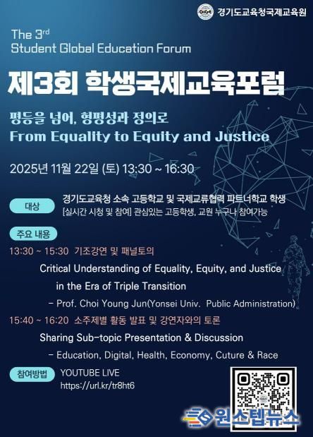 원스텝뉴스 이병희 기자 | 경기도교육청국제교육원이 22일 국내외 학생을 대상으로 ‘제3회 학생국제교육포럼’을 개최한다.
