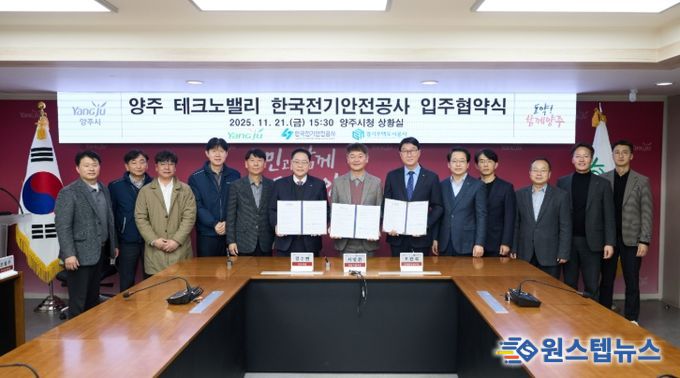 원스텝뉴스 이병희 기자 | 양주시가 21일 시청 상황실에서 한국전기안전공사, 경기주택도시공사(GH)와 한국전기안전공사 경기북부본부의 경기양주 테크노밸리 입주를 위한 3자 협약을 체결했다.
