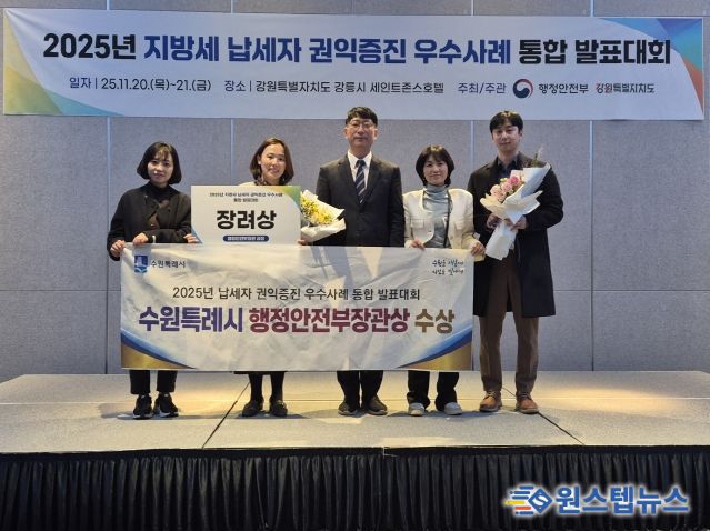 원스텝뉴스 이병희 기자 | 수원특례시가 행정안전부 주관으로 20~21일 강릉시 세인트존스호텔에서 열린 ‘2025년 납세자 권익 증진 우수사례 통합 발표대회’에서 장려상을 받았다.