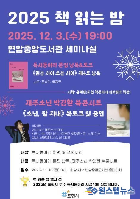 원스텝뉴스 천규영 기자 | 포천시는 오는 12월 3일 면암중앙도서관에서 ‘2025 포천시 독서동아리 책 읽는 밤’ 행사를 개최한다.