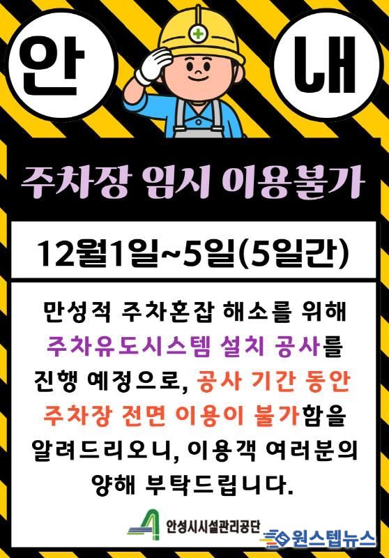 원스텝뉴스 이병희 기자 | 안성시시설관리공단은 12월 1일부터 5일까지 5일간 석정동 공영주차장 주차유도시스템 설치 공사로 해당 주차장 이용을 한시적으로 중단한다고 밝혔다.