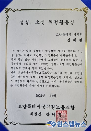 원스텝뉴스 이병희 기자 | 고양특례시의회 건설교통위원회 김해련 의원(일산2동·정발산동·중산1·2동)은 21일 열린 고양시공무원노동조합 ‘2025년도 베스트시의원상’을 4년 연속 수상했다.