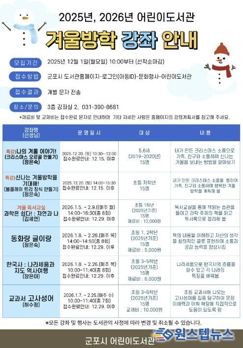 원스텝뉴스 이병희 기자 | 군포시 어린이도서관은 오는 12월부터 겨울방학을 맞은 어린이들이 한 해를 즐거운 독서문화강좌로 마무리하고 뜻깊은 방학을 보낼 수 있도록 다양한 프로그램을 운영한다고 밝혔다. 12월 20일 크리스마스 맞이 특강을 시작으로 겨울 독서교실과 여러 분야의 강좌가 마련돼 어린이들의 독서 습관 형성과 지식 탐구를 돕는다.