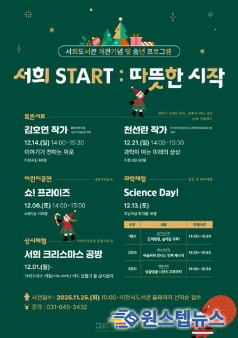 원스텝뉴스 천규영 기자 | 이천시 서희도서관은 개관을 기념하고 한 해를 마무리하는 송년 행사로, 시민들과 함께하는 문화예술과학 프로그램인 ‘서희 START : 따뜻한 시작’을 12월 한 달간 운영한다고 밝혔다.