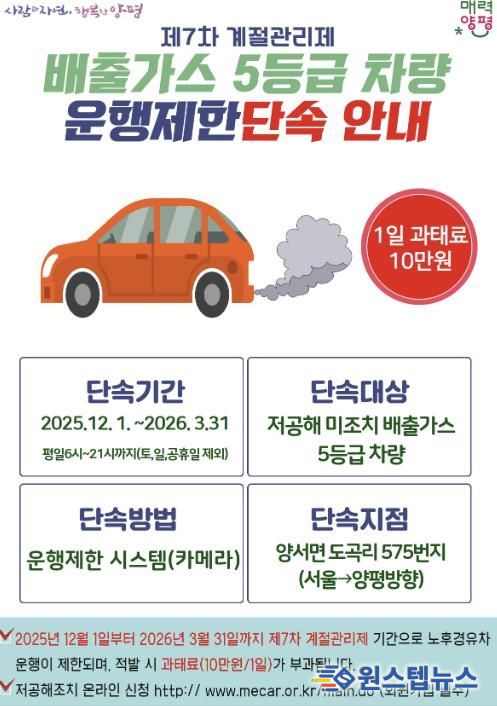 원스텝뉴스 이병희 기자 | 양평군(은 오는 12월 1일부터 2026년 3월 31일까지 제7차 미세먼지 계절 관리제 시행에 따라 배출가스 5등급 차량에 대한 운행 제한 단속을 시행한다고 밝혔다.