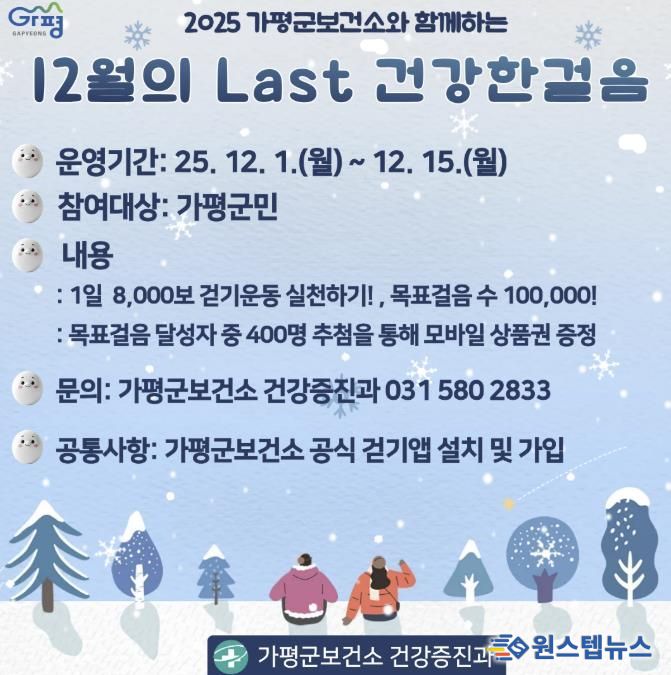 가평군보건소는 12월 1일부터 15일까지 군민을 대상으로 올해 마지막 걷기 프로그램을 운영한다. 참여자는 하루 8,000보 걷기와 총 10만 보 달성을 목표로 하며, 목표를 달성한 주민 중 400명을 추첨해 모바일 상품권을 지급한다. 참여를 위해서는 가평군보건소 공식 걷기앱 설치 및 가입이 필요하다. 자세한 문의는 가평군보건소 건강증진과로 하면 된다.