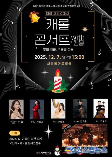 원스텝뉴스 천규영 기자 | 경기도 오산시 소리울도서관은 연말을 맞아 시민들에게 겨울 감성을 선사하는 '미리 크리스마스 – 캐롤 콘서트 with 캔들'을 오는 12월 7일 오후 3시 소리울아트리움에서 개최한다고 밝혔다.