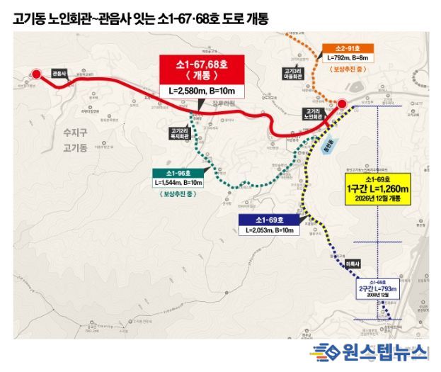 원스텝뉴스 이병희 기자 | 용인특례시는 지난 11월 30일 수지구 고기동 노인회관에서 관음사까지 이어지는 도시계획도로 소1-67·68호선(연장 2.58km)을 개통했다고 1일 밝혔다.