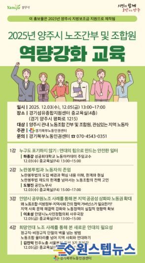 원스텝뉴스 이병희 기자 | 양주시가 관내 노동조합을 대상으로 ‘2025년 노조 간부 및 조합원 역량 강화교육’을 진행한다.