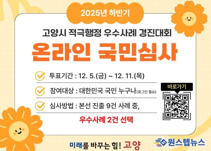 원스텝뉴스 이병희 기자 | 고양특례시는 오는 12월 15일 ‘2025년 하반기 고양시 적극행정 우수사례 경진대회’에서 시민 행복을 위해 적극행정을 펼친 우수공무원과 산하 공공기관 우수직원을 선발한다.