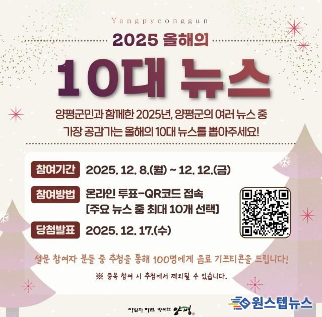 원스텝뉴스 이병희 기자 | 양평군은 ‘2025년 양평군 올해의 10대 뉴스’ 선정을 위한 온라인 투표를 오는 8일부터 12일까지 실시한다고 밝혔다.