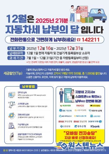 원스텝뉴스 이병희 기자 | 평택시는 2025년 12월 정기분 자동차세 16만 5천 건에 대해 199억 원을 부과·고지하고 납부 기한 내 납부하도록 적극적인 홍보에 나섰다고 밝혔다.