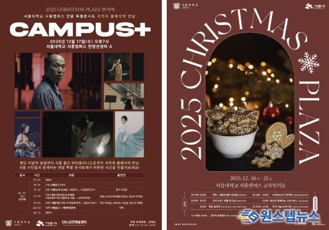 원스텝뉴스 천규영 기자 | 시흥시와 서울대학교 시흥캠퍼스가 오는 12월 17일부터 21일까지 특별 행사인 ‘2025 크리스마스 플라자(CHRISTMAS PLAZA)’를 개최한다. 올해 행사는 단 하루만 열리는 전야제 특별콘서트 ‘캠퍼스 플러스’를 중심으로, 국악과 클래식을 대표하는 최정상급 연주자들이 한자리에 모여 연말 분위기를 고조시킬 예정이다.