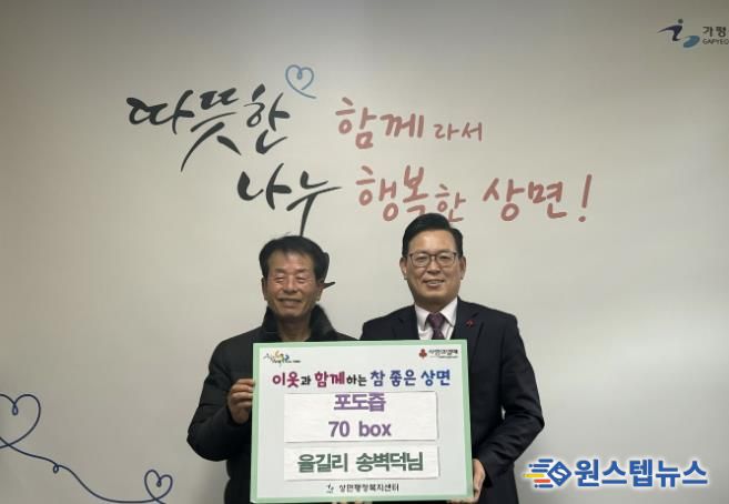 서태원 상면장은 “어려운 가운데서도 직접 재배한 포도로 만든 포도즙을 기탁해주신 송병덕님께 진심으로 감사를 드린다”며 ”이번 나눔은 우리 지역공동체가 서로 배려하고 협력하는 문화를 확산하는 데 큰 힘이 될 것이다“라고 전했다.