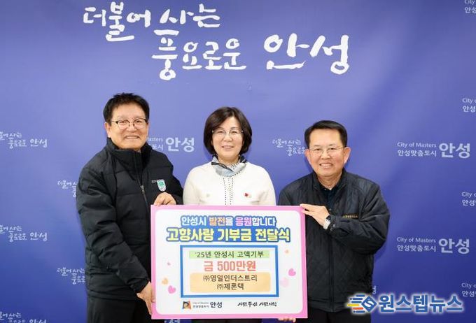 원스텝뉴스 이병희 기자 | 안성시는 ㈜영인인더스트리 김대영 대표와 ㈜제론텍 김진수 대표가 안성시에 고향사랑기부금 500만 원을 기탁했다고 밝혔다. 두 대표는 한 해 동안의 경영 성과를 지역사회와 나누고자 하는 뜻을 모아 안성시에 따뜻한 마음을 전했다.