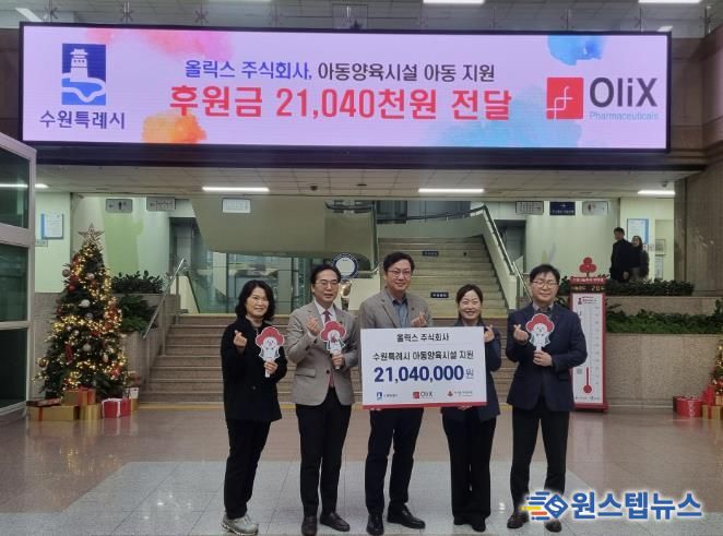 이동기 올릭스 대표이사는 “양육시설에서 사는 아동들이 따뜻한 겨울을 보내길 바라며 후원금을 준비했다”며 “아이들이 꿈을 꾸며 자라는 수원시가 됐으면 한다”고 말했다.