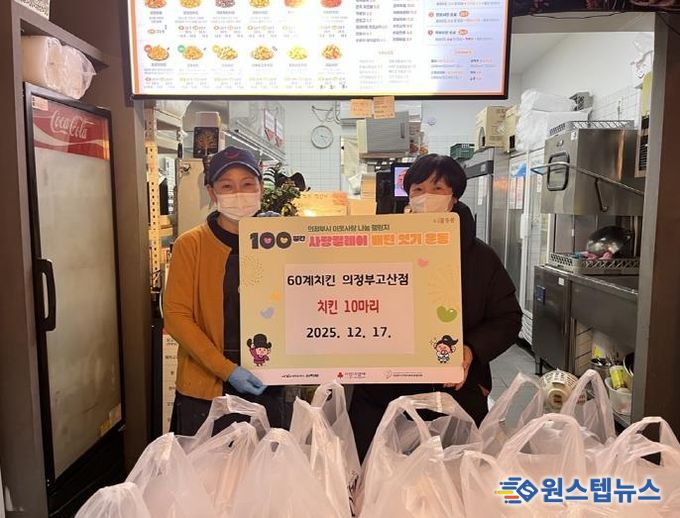 원스텝뉴스 이병희 기자 | 의정부시 고산동주민센터는 12월 17일 60계치킨 의정부고산점이 치킨 10마리를 기탁하며 ‘100일간 사랑릴레이 배턴 잇기’에 동참했다고 밝혔다.