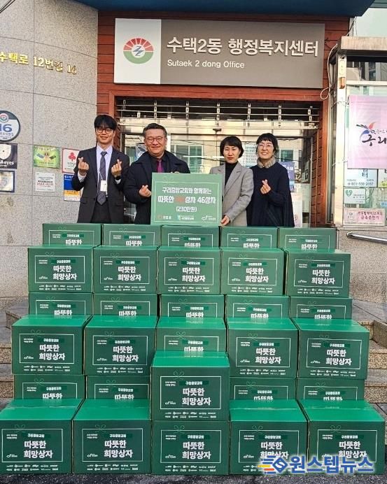 원스텝뉴스 이병희 기자 | 구리시 수택2동은 지난 12월 18일 지역사회 이웃사랑 실천의 하나로 구리중앙교회와 국제구호단체 ‘기아대책’이 함께 마련한 희망 상자 46박스를 전달받았다.