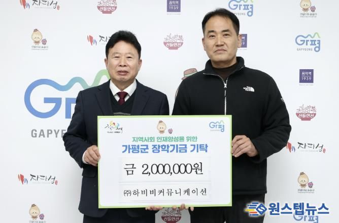 원스텝뉴스 이병희 기자 | ㈜하비비커뮤니케이션 강동구 대표는 지난 17일 가평군청을 방문해 가평군 교육발전을 위한 장학금 200만 원을 전달했다.