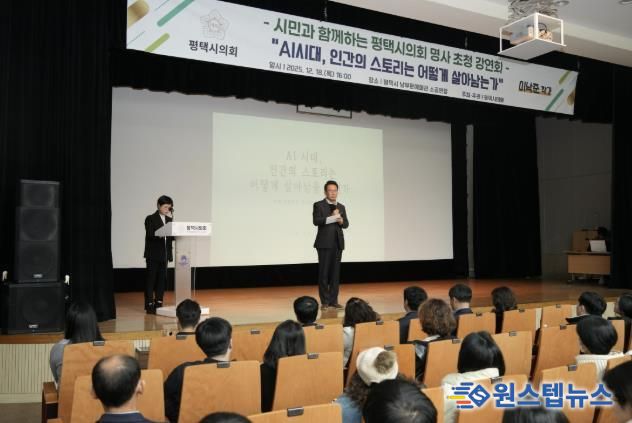 원스텝뉴스 이병희 기자 | 평택시의회는 12월 18일, 평택시 남부문화예술회관 소공연장에서 명사를 초청해‘AI시대, 인간의 스토리는 어떻게 살아남는가’를 주제로 강연회를 열었다.
