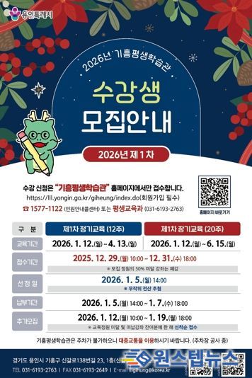 원스텝뉴스 이병희 기자 | 용인특례시 기흥평생학습관은 29일부터 31일까지 생성형 인공지능(AI), 웃음치료사, 영어 등 ‘2026년 제1차 정기·장기교육’ 수강생을 모집한다고 21일 밝혔다.