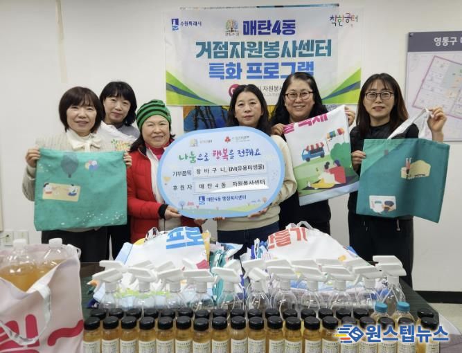 원스텝뉴스 이병희 기자 | 수원시 매탄4동 자원봉사캠프 코치와 봉사회원들은 지난 12월 19일, 지역 상권 활성화와 마을 공동체 활성화를 위해 회원들이 직접 만든 장바구니와 EM(유용 미생물)을 매탄4동 행정복지센터에 전달했다.