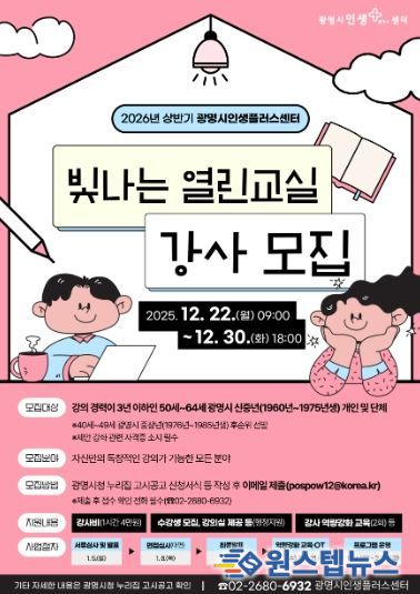 원스텝뉴스 이병희 기자 | 광명시는 오는 30일까지 ‘2026년 상반기 빛나는 열린교실’에 참여할 신중년 아마추어 강사를 모집한다.