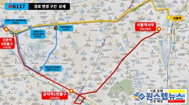 이번 운행경로 변경으로 기존 신촌오거리.현대백화점(중), 신촌오거리.2호선신촌역, 이화여대입구, 마포자이2차아파트.대흥역 정류소은 미정차하고, 신촌역8번출구(14228), 공덕역1번출구(14180), 서울역서부(02105) 정류소에 정차하게 된다.