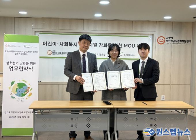 원스텝뉴스 이병희 기자 | 고양특례시에서 위탁 운영하고 있는 고양시 어린이·사회복지급식관리지원센터는 지난 22일 풀무원 푸드머스와 업무협약(MOU)을 체결하고, 고양시 관내 어린이·사회복지 급식소의 위생·안전 및 영양관리 수준 향상을 위해 상호 협력하기로 했다.