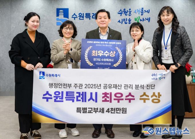 원스텝뉴스 이병희 기자 | 수원특례시가 행정안전부 주관 ‘2025년 공유재산 관리 분석·진단 평가’에서 최우수 지자체로 선정돼 특별교부세 4000만 원을 확보했다. 시상식은 22일 정부서울청사에서 열렸다.