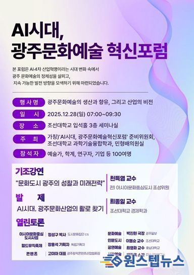 이날 포럼에서는 천득염 전남대 명예교수(전 아시아문화중심도시 조성위원)가 ‘문화도시 광주의 성찰과 미래전략’을 주제로 기조강연에 나선다. 이어 최종일 조선대 경제학과 교수가 ‘AI 시대, 광주문화산업의 활로 찾기’를 주제로 발제한다.